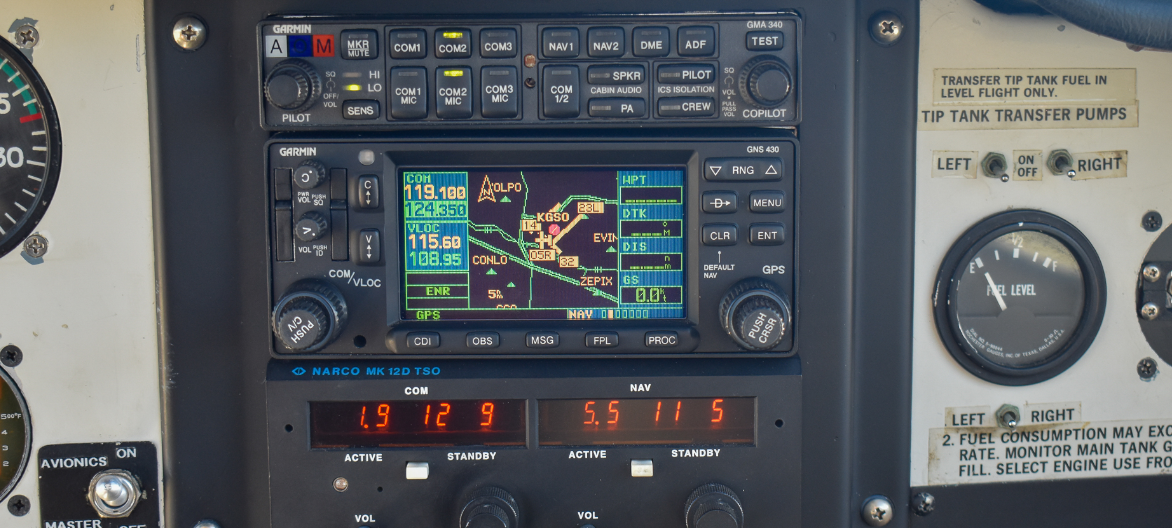 Audio Panel Garmin GMA-340 Audio Panel w 4 Place Intercom GPS/Nav/Com #1 Garmin GNS-430W GPS/Nav/Com w WAAS Nav/Com #2 Narco MK 12D TSO Digital Nav/Com Stormscope Insight Strikefinder Stormscope Transponder Garmin GTX 327 Transponder Engine Monitor Insight Graphic Engine Monitor Avionics Master Switch |