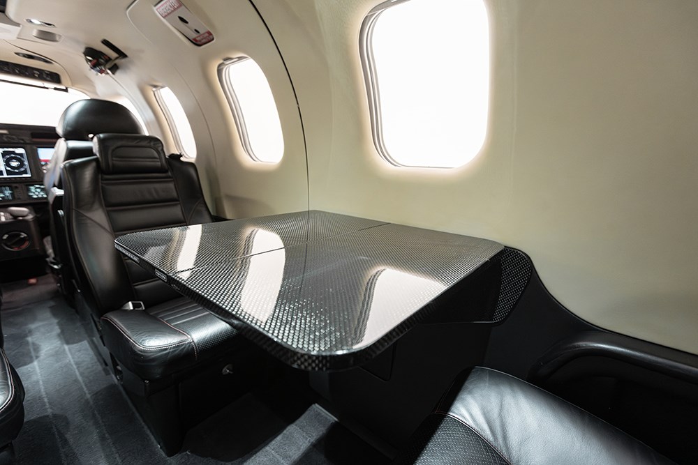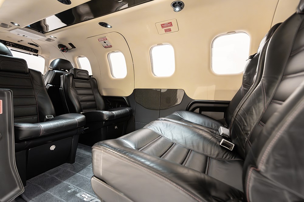 | Elite configurable Interior. Socata TBM Black Diamond Edition with Black Onyx leather seats, Flat Black metal vents and lights with Carbon Fiber table and upper accent package. Six genuine leather seats with adjustable backrests and folding arm rests. Leather upper cabin side panels in Polynesian Pearl, leather covered lower cabin side panels in Black Onyx. | |